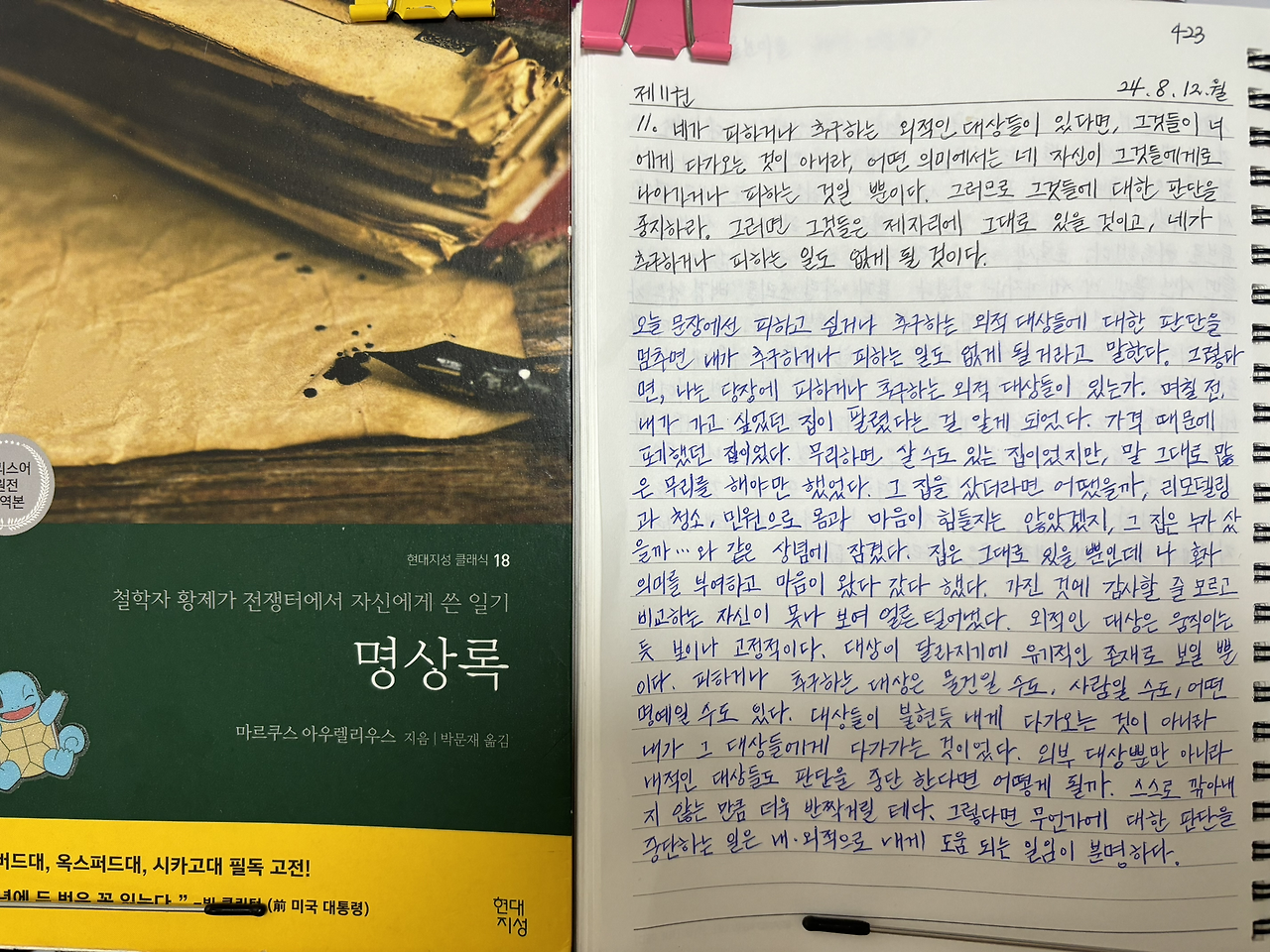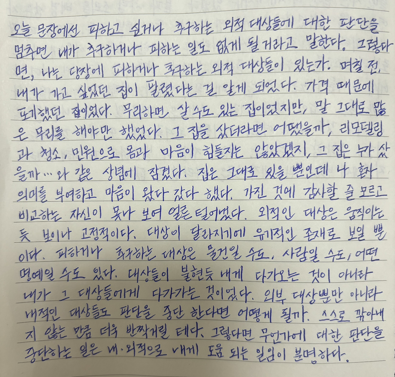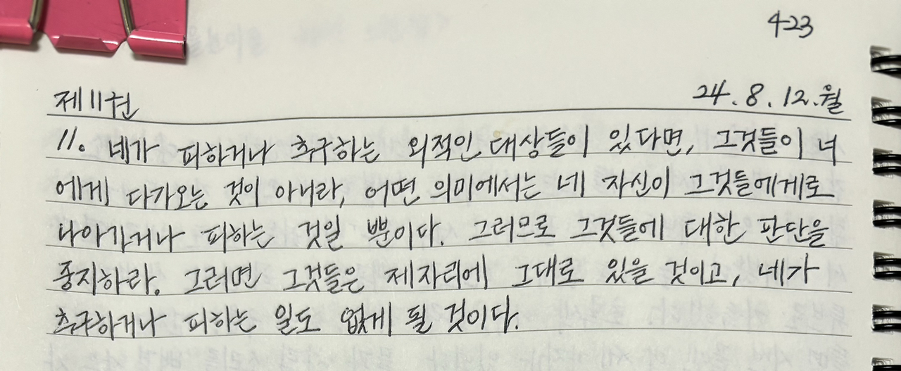 오늘 문장에선 피하고 싶거나 추구하는 외적 대상들에 대한 판단을 멈추면 내가 추구하거나 피하는 일도 없게 될 거라고 말한다.
