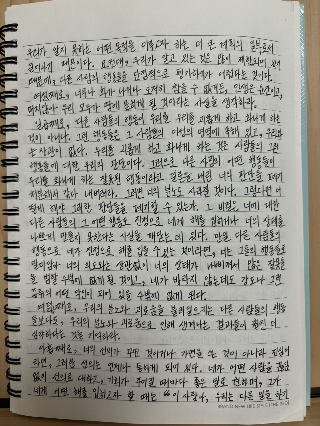 7. 다른 사람들의 행동이 우리를 괴롭게 하고 화나게 하는 것이 아니다. 그런 행동들은 그 사람들의 이성의 영역에 속해 있고, 우리와는 상관이 없다.