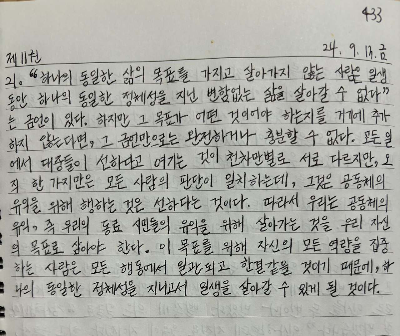 모든 일에서 대중들이 선하다고 여기는 것이 천차만별로 서로 다르지만, 오직 한 가지만은 모든 사람의 판단이 일치하는데, 그것은 공동체의 유익을 위해 행하는 것은 선하다는 것이다.