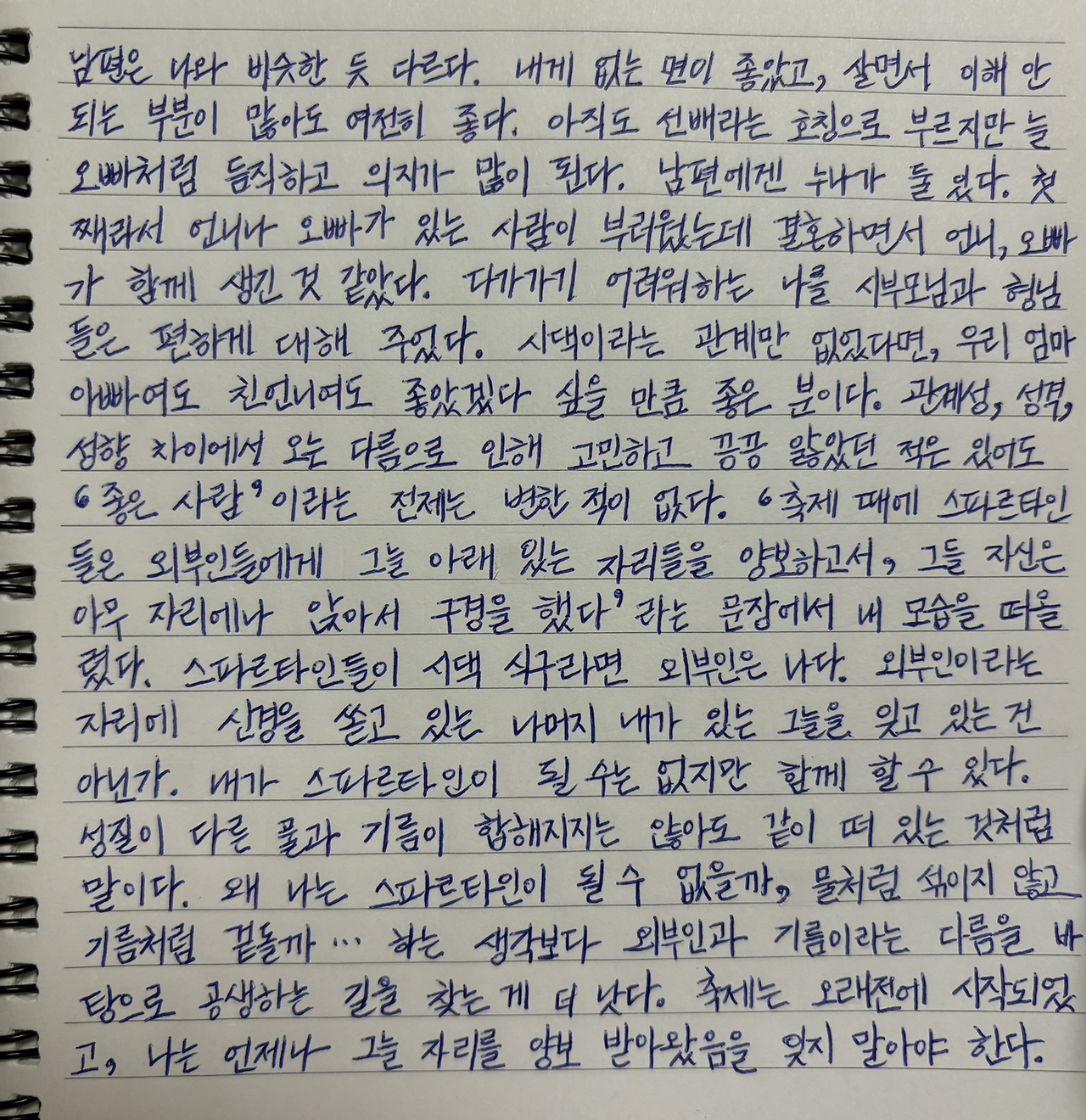 왜 나는 스파르타인이 될 수 없을까, 물처럼 섞이지 않고 기름처럼 겉돌까… 하는 생각보다 외부인과 기름이라는 다름을 바탕으로 공생하는 길을 찾는 게 더 낫다.