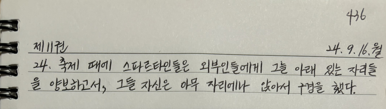 '축제 때에 스파르타인들은 외부인들에게 그늘 아래 있는 자리들을 양보하고서, 그들 자신은 아무 자리에나 앉아서 구경을 했다.'라는 문장에서 내 모습을 떠올렸다.