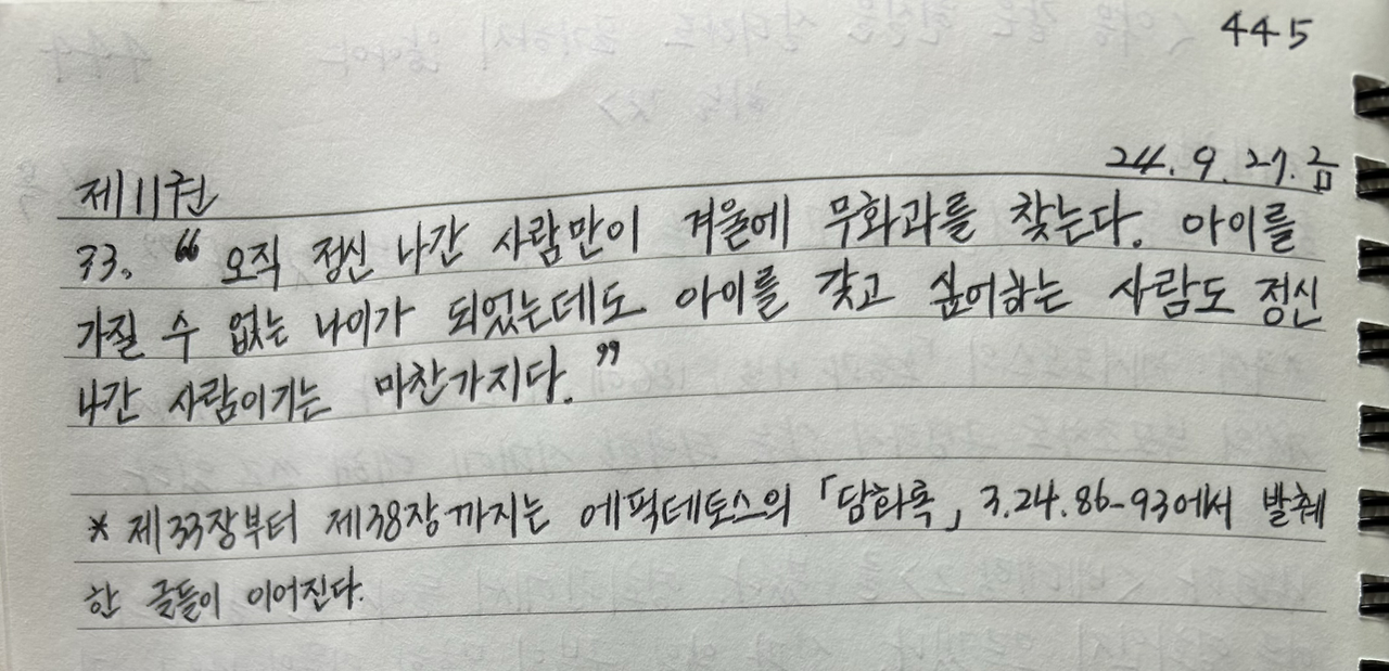 “오직 정신 나간 사람만이 겨울에 무화과를 찾는다. 아이를 가질 수 없는 나이가 되었는데도 아이를 갖고 싶어 하는 사람도 정신 나간 사람이기는 마찬가지다.”