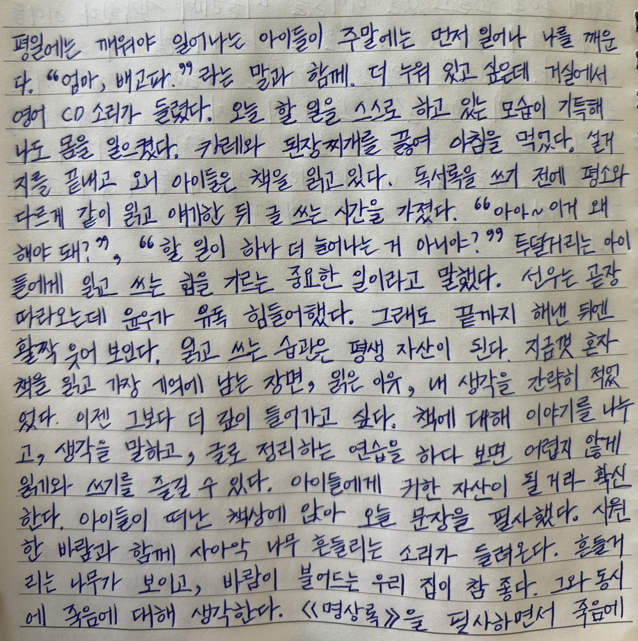 아이들이 떠난 책상에 앉아 오늘 문장을 필사했다.