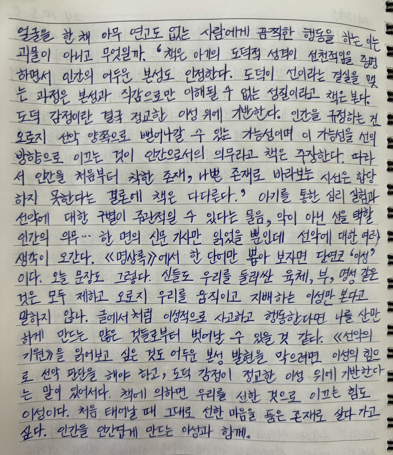 《선악의 기원》을 읽어보고 싶은 것도 어두운 본성 발현을 막으려면 이성의 힘으로 선악 판단을 해야 하고, 도덕감정이 정교한 이성 위에 기반한다는 말이 있어서다.