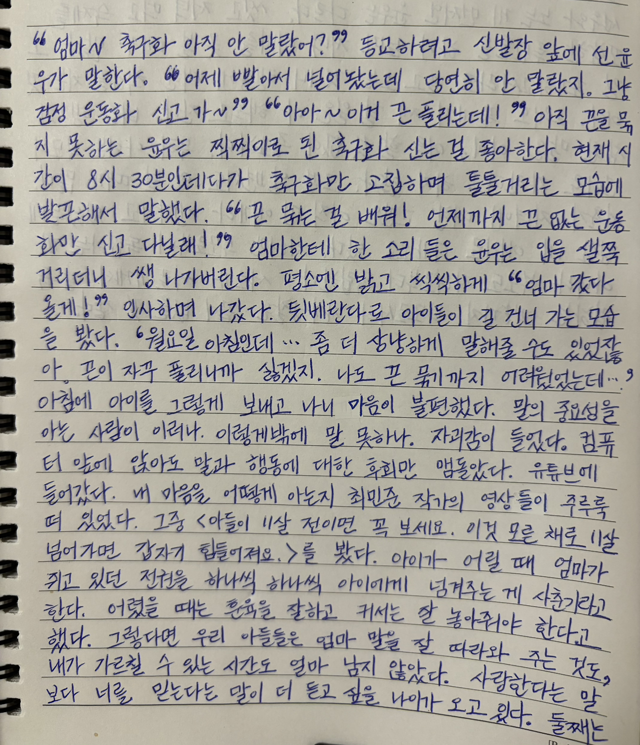 '월요일 아침인데… 좀 더 상냥하게 말해줄 수도 있었잖아. 끈이 자꾸 풀리니까 싫겠지. 나도 끈 묶기까지 어려웠었는데….'