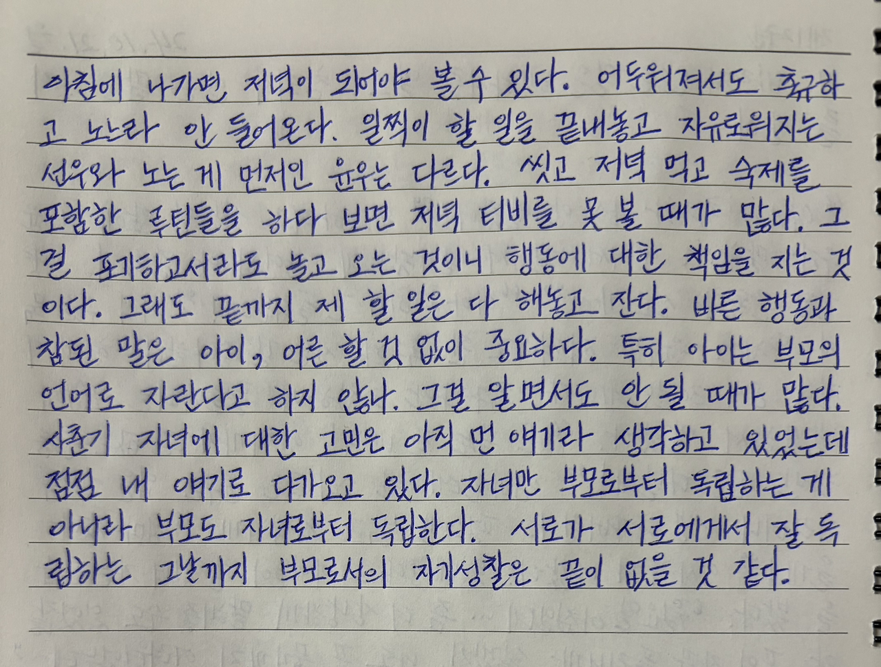 서로가 서로에게서 잘 독립하는 그날까지 부모로서의 자기 성찰은 끝이 없을 것 같다.