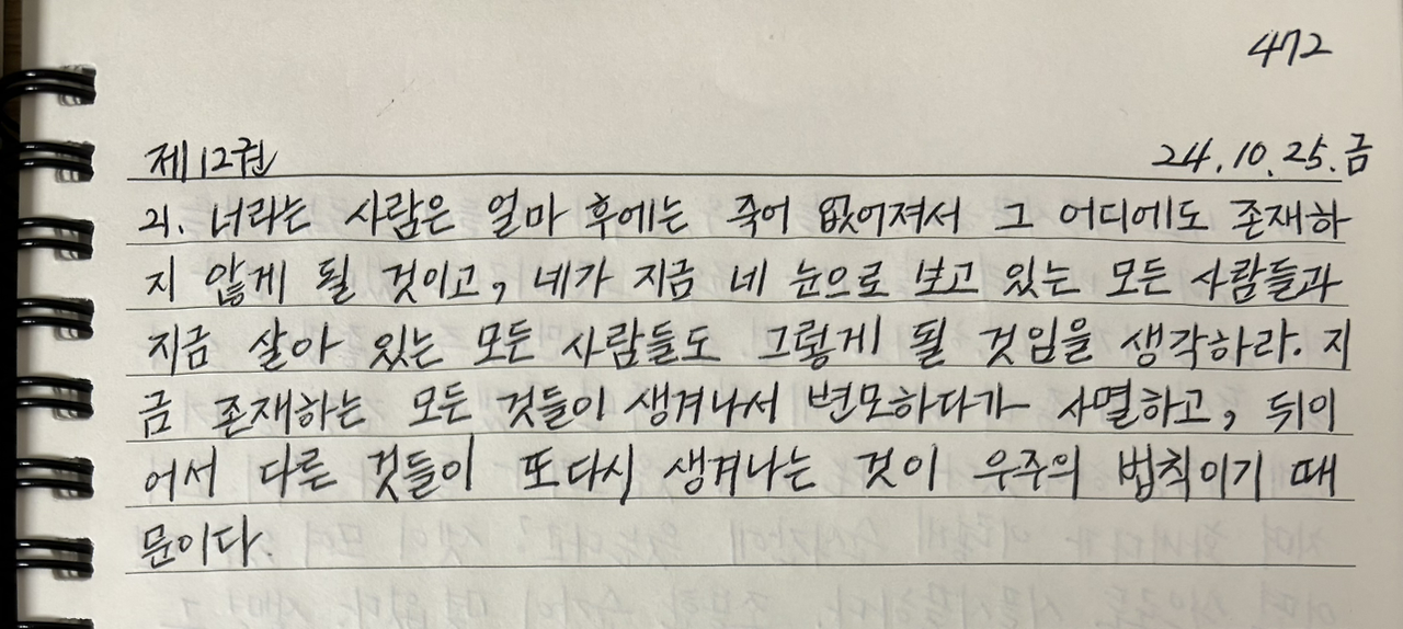 너라는 사람은 얼마 후에는 죽어 없어져서 그 어디에도 존재하지 않게 될 것이고, 네가 지금 네 눈으로 보고 있는 모든 사람들과 지금 살아 있는 모든 사람들도 그렇게 될 것임을 생각하라. 지금 존재하는 모든 것들이 생겨나서 변모하다가 사멸하고, 뒤이어서 다른 것들이 또다시 생겨나는 것이 우주의 법칙이기 때문이다.
