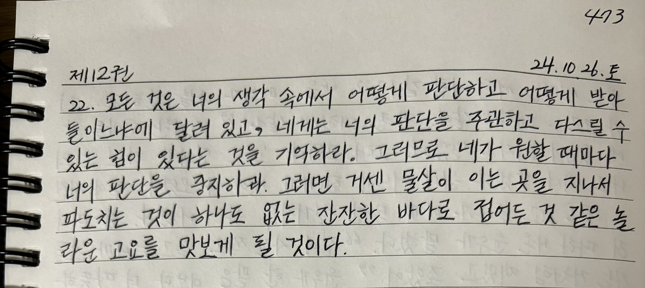 모든 것은 너의 생각 속에서 어떻게 판단하고 어떻게 받아들이느냐에 달려 있고, 네게는 너의 판단을 주관하고 다스릴 수 있는 힘이 있다는 것을 기억하라. 그러므로 네가 원할 때마다 너의 판단을 중지하라. 그러면 거센 물살이 이는 곳을 지나서 파도치는 것이 하나도 없는 잔잔한 바다로 접어든 것 같은 놀라운 고요를 맛보게 될 것이다.
