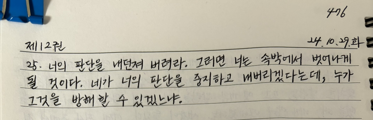 너의 판단을 내던져 버려라. 그러면 너는 속박에서 벗어나게 될 것이다. 네가 너의 판단을 중지하고 내버리겠다는데, 누가 그것을 방해할 수 있겠느냐.