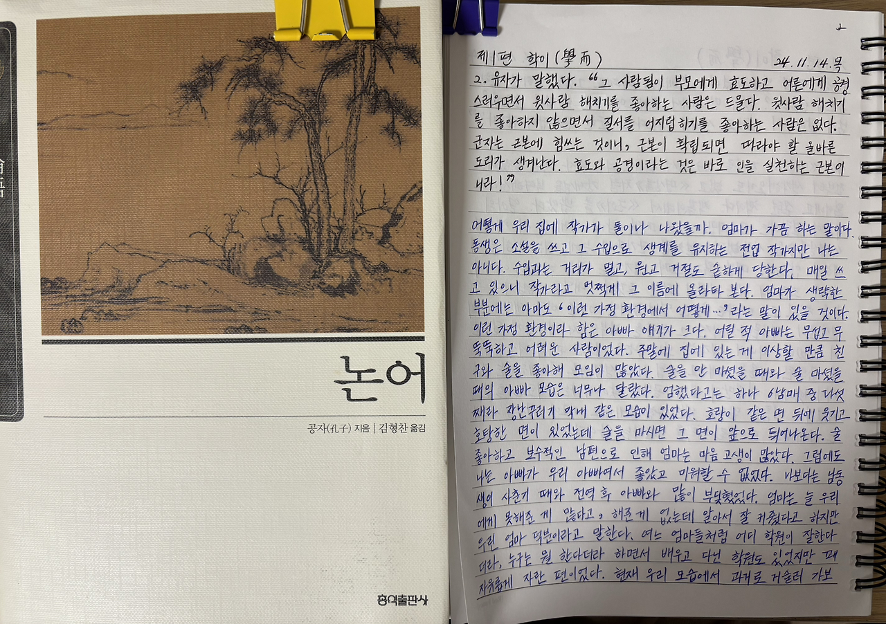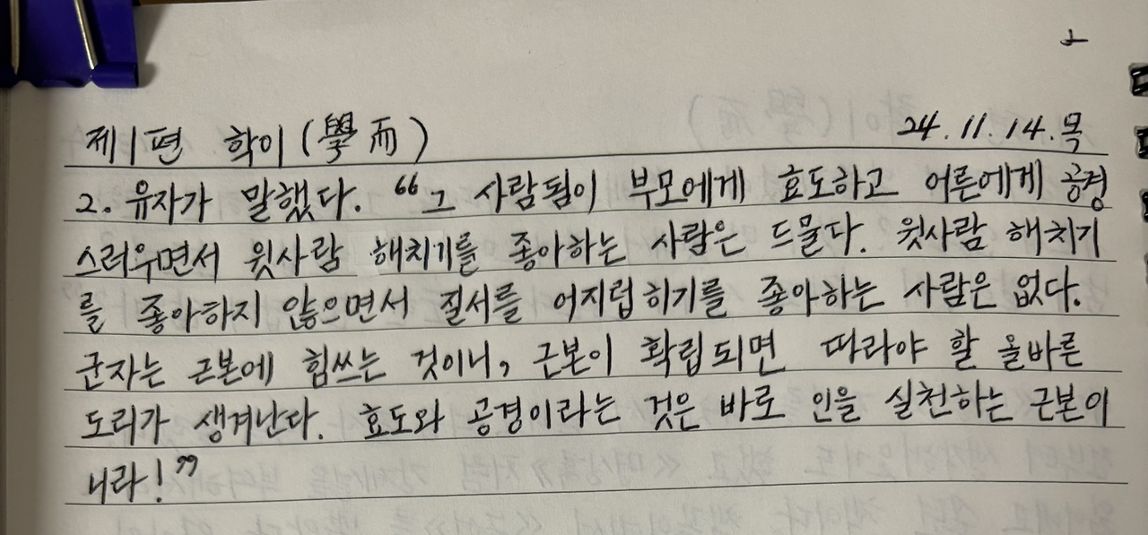 유자가 말했다. "그 사람됨이 부모에게 효도하고 어른에게 공경스러우면서 윗사람 해치기를 좋아하는 사람은 드물다. 윗사람 해치기를 좋아하지 않으면서 질서를 어지럽히기를 좋아하는 사람은 없다. 군자는 근본에 힘쓰는 것이니, 근본이 확립되면 따라야 할 올바른 도리가 생겨난다. 효도와 공경이라는 것은 바로 인을 실천하는 근본이니라!"