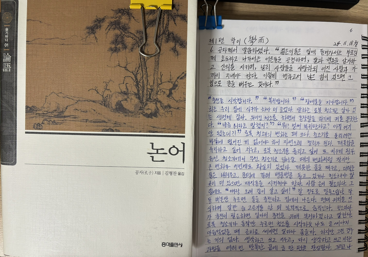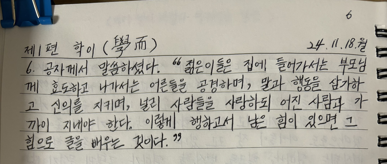 공자께서 말씀하셨다. “젊은이들은 집에 들어가서는 부모님께 효도하고 나가서는 어른들을 공경하며, 말과 행동을 삼가하고 신의를 지키며, 널리 사람들을 사랑하되 어진 사람과 가까이 지내야 한다. 이렇게 행하고서 남은 힘이 있으면 그 힘으로 글을 배우는 것이다.”