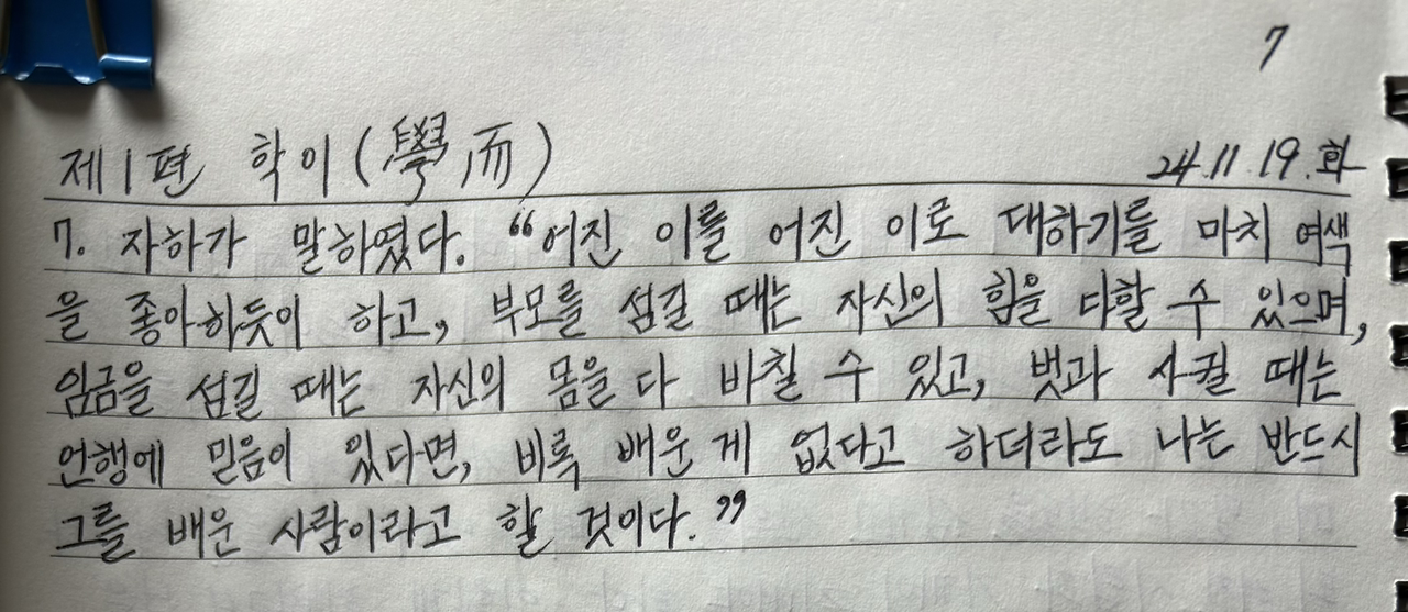 자하가 말하였다. “어진 이를 어진 이로 대하기를 마치 여색을 좋아하듯이 하고, 부모를 섬길 때는 자신의 힘을 다할 수 있으며, 임금을 섬길 때는 자신의 몸을 다 바칠 수 있고, 벗과 사귈 때는 언행에 믿음이 있다면, 비록 배운 게 없다고 하더라도 나는 반드시 그를 배운 사람이라고 할 것이다.”