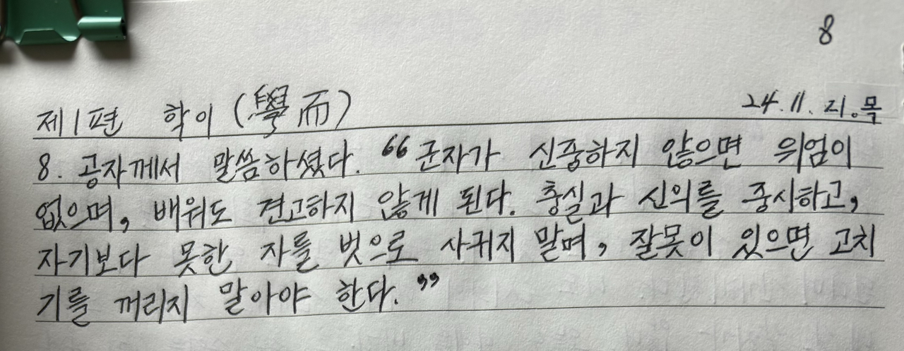 공자께서 말씀하셨다. “군자가 신중하지 않으면 위엄이 없으며, 배워도 견고하지 않게 된다. 충실과 신의를 중시하고, 자기보다 못한 자를 벗으로 사귀지 말며, 잘못이 있으면 고치기를 꺼리지 말아야 한다.”