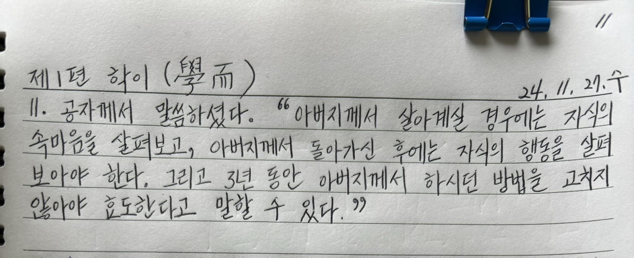 공자께서 말씀하셨다. “아버지께서 살아계실 경우에는 자식의 속마음을 살펴보고, 아버지께서 돌아가신 후에는 자식의 행동을 살펴보아야 한다. 그리고 3년 동안 아버지께서 하시던 방법을 고치지 않아야 효도한다고 말할 수 있다.”