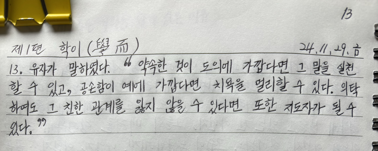 유자가 말하였다. “약속한 것이 도의에 가깝다면 그 말을 실천할 수 있고, 공손함이 예에 가깝다면 치욕을 멀리할 수 있다. 의탁하여도 그 친한 관계를 잃지 않을 수 있다면 또한 지도자가 될 수 있다.”