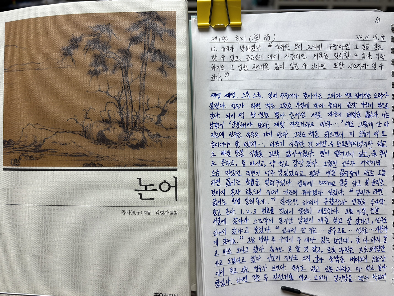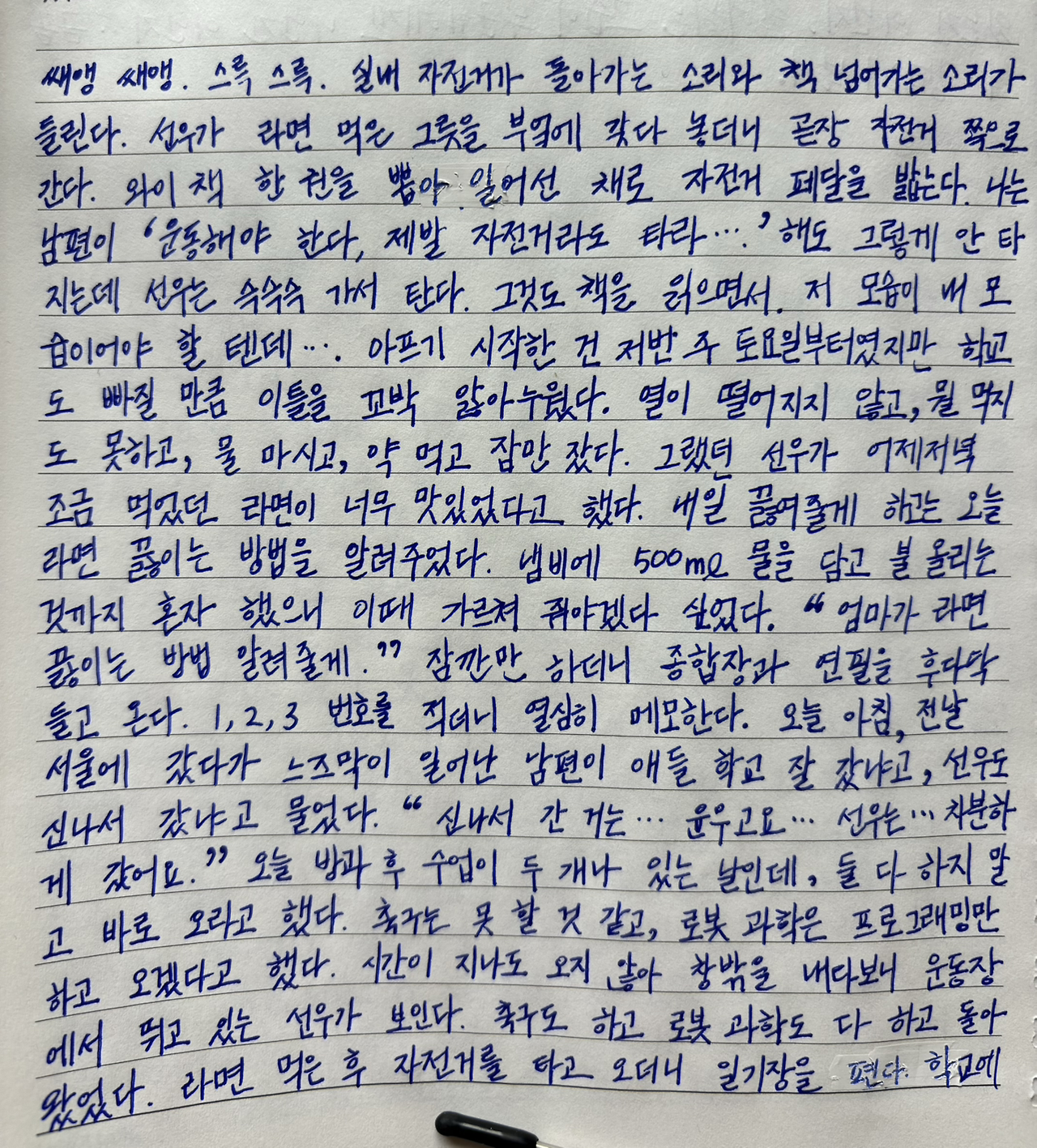 라면 먹은 후 자전거를 타고 오더니 일기장을 편다.