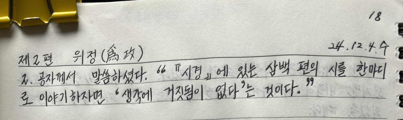 공자께서 말씀하셨다. “『시경』에 있는 삼백 편의 시를 한마디로 이야기하자면 ‘생각이 거짓됨이 없다’는 것이다.”