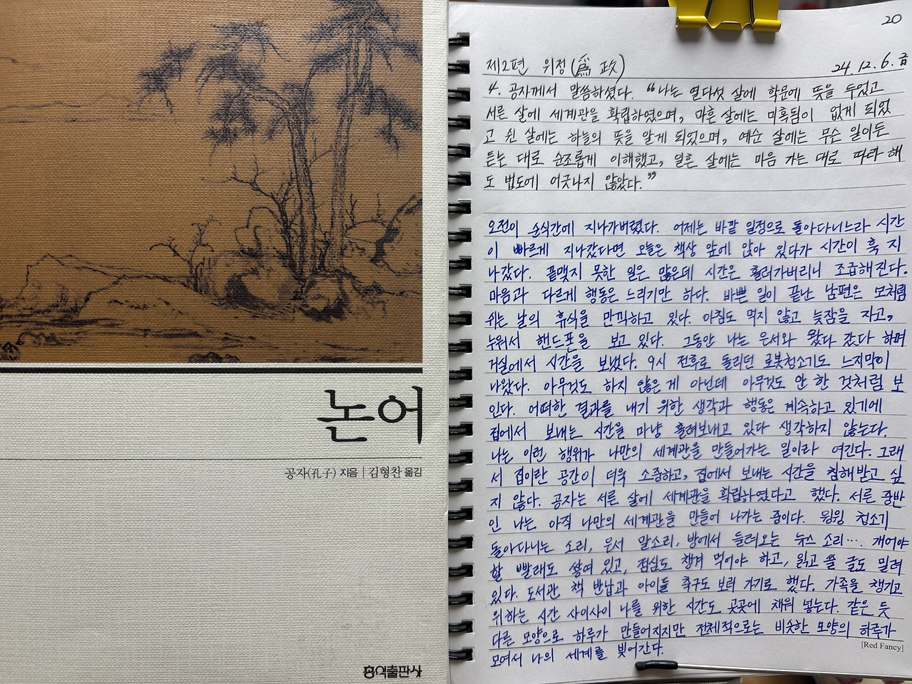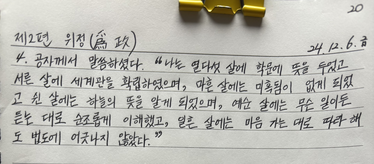 공자께서 말씀하셨다. “나는 열다섯 살에 학문에 뜻을 두었고 서른 살에 세계관을 확립하였으며, 마흔 살에는 미혹됨이 없게 되었고 쉰 살에는 하늘의 뜻을 알게 되었으며, 예순 살에는 무슨 일이든 듣는 대로 순조롭게 이해했고, 일흔 살에는 마음 가는 대로 따라 해도 법도에 어긋나지 않았다.”