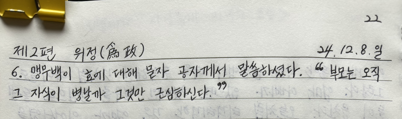 맹무백이 효에 대해 묻자 공자께서 말씀하셨다. “부모는 오직 그 자식이 병날까 그것만 근심하신다.”