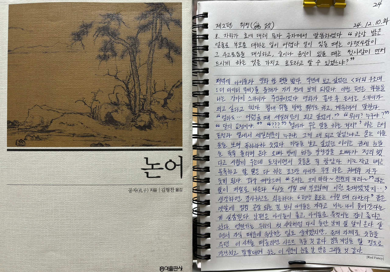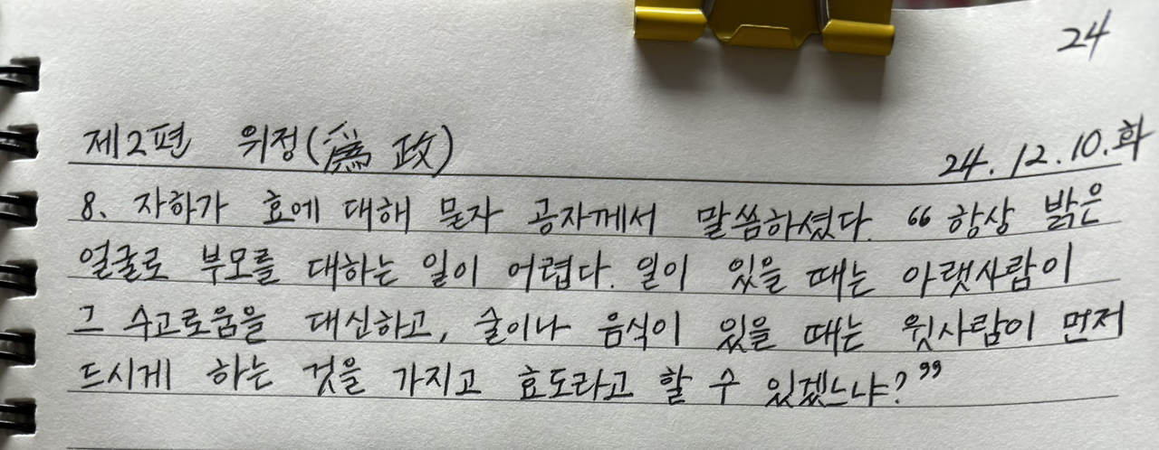 자하가 효에 대해 묻자 공자께서 말씀하셨다. “항상 밝은 얼굴로 부모를 대하는 일이 어렵다. 일이 있을 때는 아랫사람이 그 수고로움을 대신하고, 술이나 음식이 있을 때는 윗사람이 먼저 드시게 하는 것을 가지고 효도라고 할 수 있겠느냐?”
