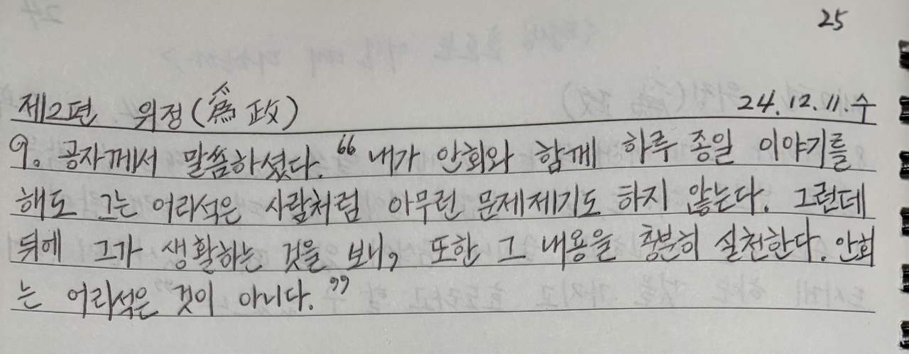 공자께서 말씀하셨다. “내가 안회와 함께 하루 종일 이야기를 해도 그는 어리석은 사람처럼 아무런 문제 제기도 하지 않는다. 그런데 뒤에 그가 생활하는 것을 보니, 또한 그 내용을 충분히 실천한다. 안회는 어리석은 것이 아니다.”