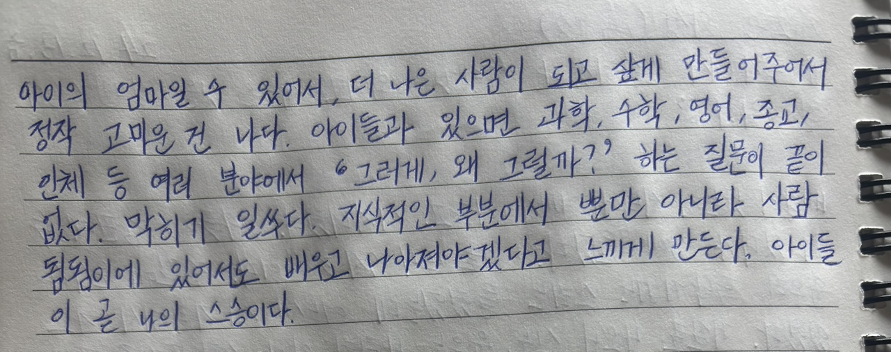 두 아이의 엄마일 수 있어서, 더 나은 사람이 되고 싶게 만들어주어서 정작 고마운 건 나다.