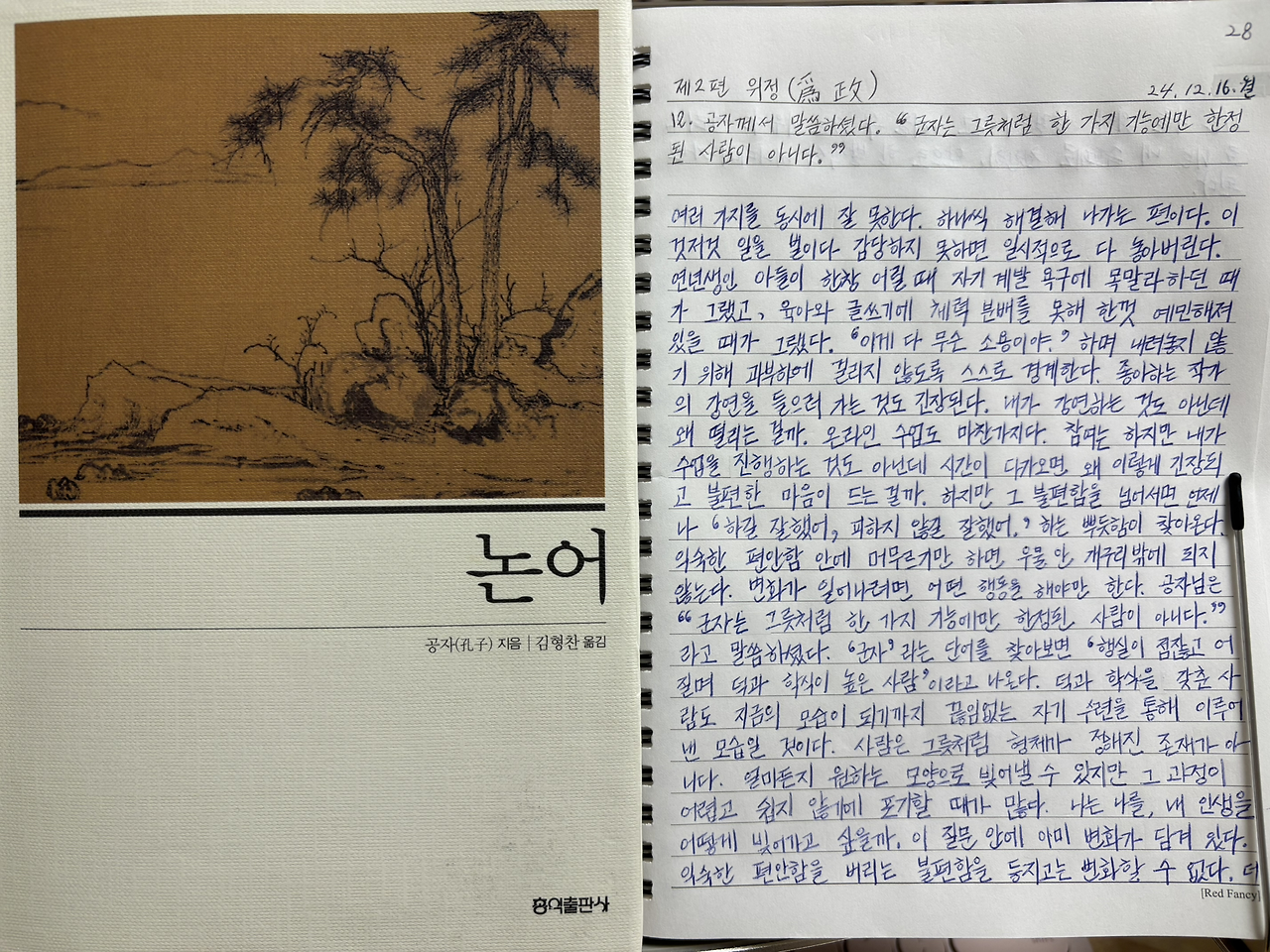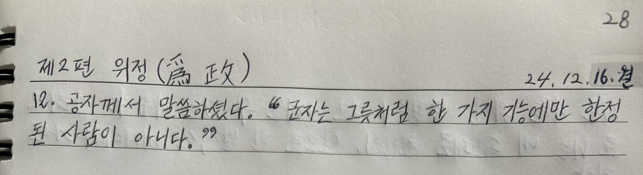 공자께서 말씀하셨다. "군자는 그릇처럼 한 가지 기능에만 한정된 사람이 아니다."