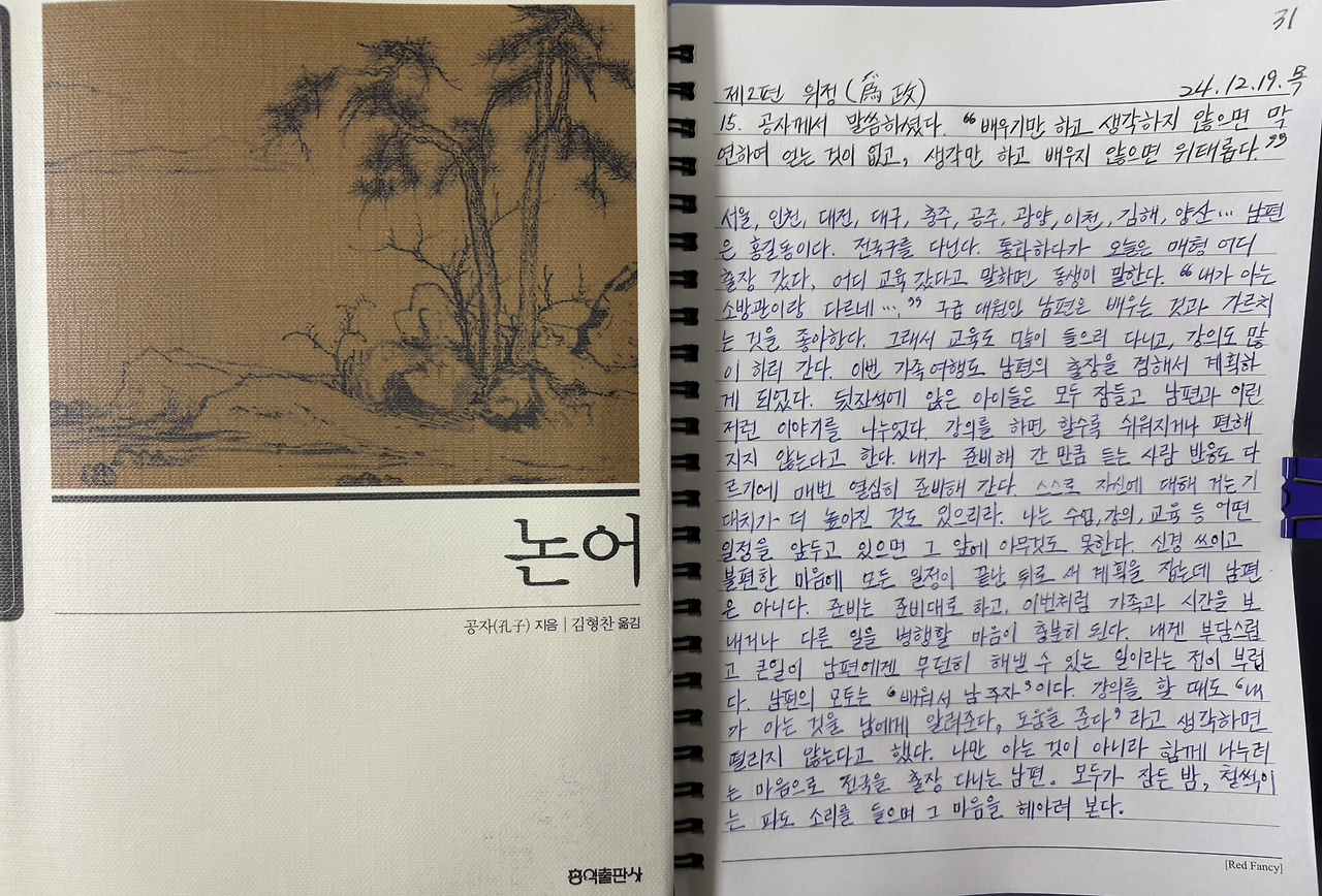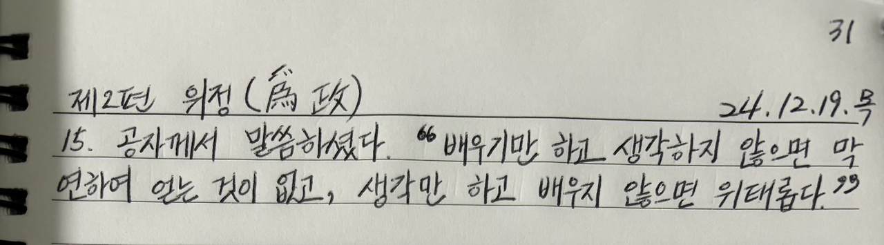 공자께서 말씀하셨다. “배우기만 하고 생각하지 않으면 막연하여 얻는 것이 없고, 생각만 하고 배우지 않으면 위태롭다.”