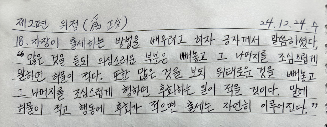공자님이 “말에 허물이 적고 행동에 후회가 적으면 출세는 자연히 이루어진다.”라고 말씀하셨다.