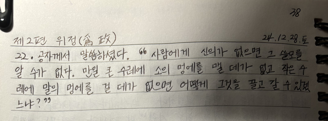 공자께서 말씀하셨다. "사람에게 신의가 없으면 그 쓸모를 알 수가 없다. 만일 큰 수레에 소의 멍에를 맬 데가 없고 작은 수레에 말의 멍에를 걸 데가 없으면 어떻게 그것을 끌고 갈 수 있겠느냐?"