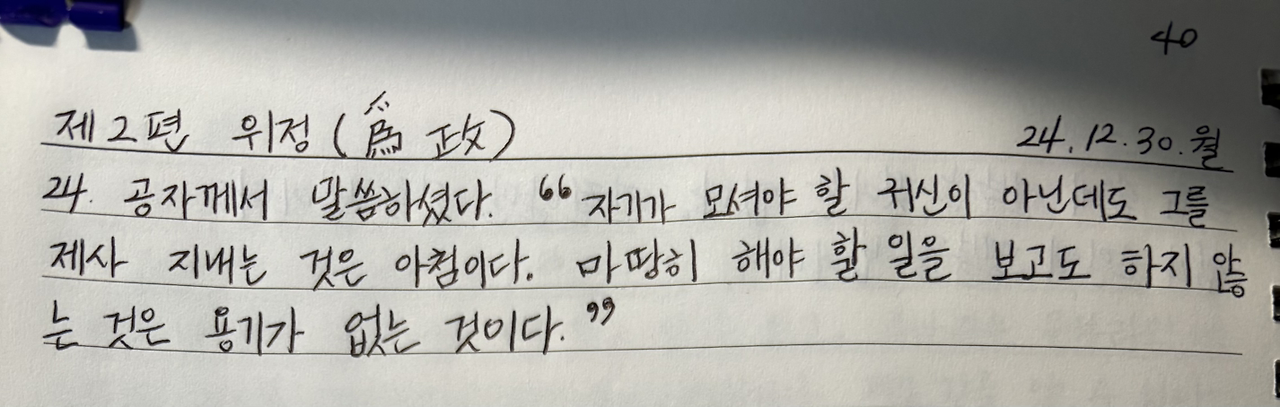 공자께서 말씀하셨다. “자기가 모셔야 할 귀신이 아닌데도 그를 제사 지내는 것은 아첨이다. 마땅히 해야 할 일을 보고도 하지 않는 것은 용기가 없는 것이다.”