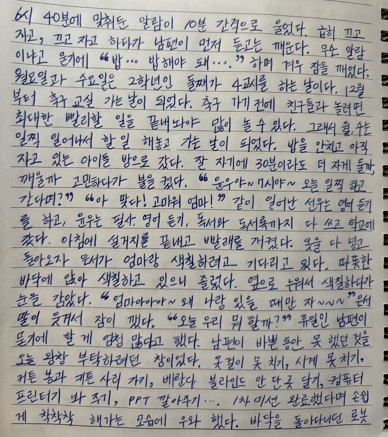 같이 일어난 선우는 영어 듣기를 하고, 윤우는 필사, 영어 듣기, 독서와 독서록까지 다 쓰고 학교에 갔다.