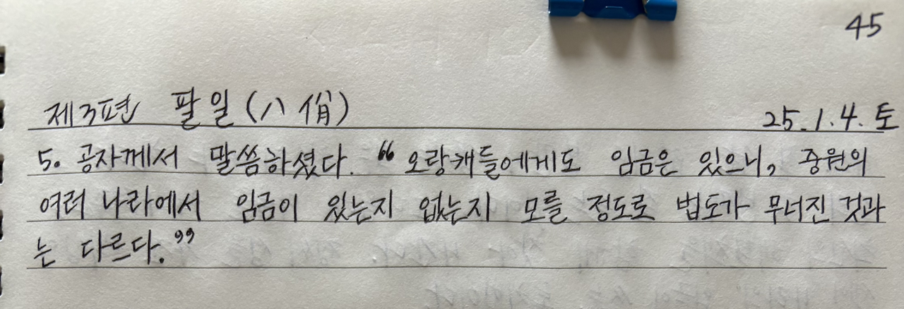 공자께서 말씀하셨다. "오랑캐들에게도 임금은 있으니, 중원의 여러 나라에서 임금이 있는지 없는지 모를 정도로 법도가 무너진 것과는 다르다."