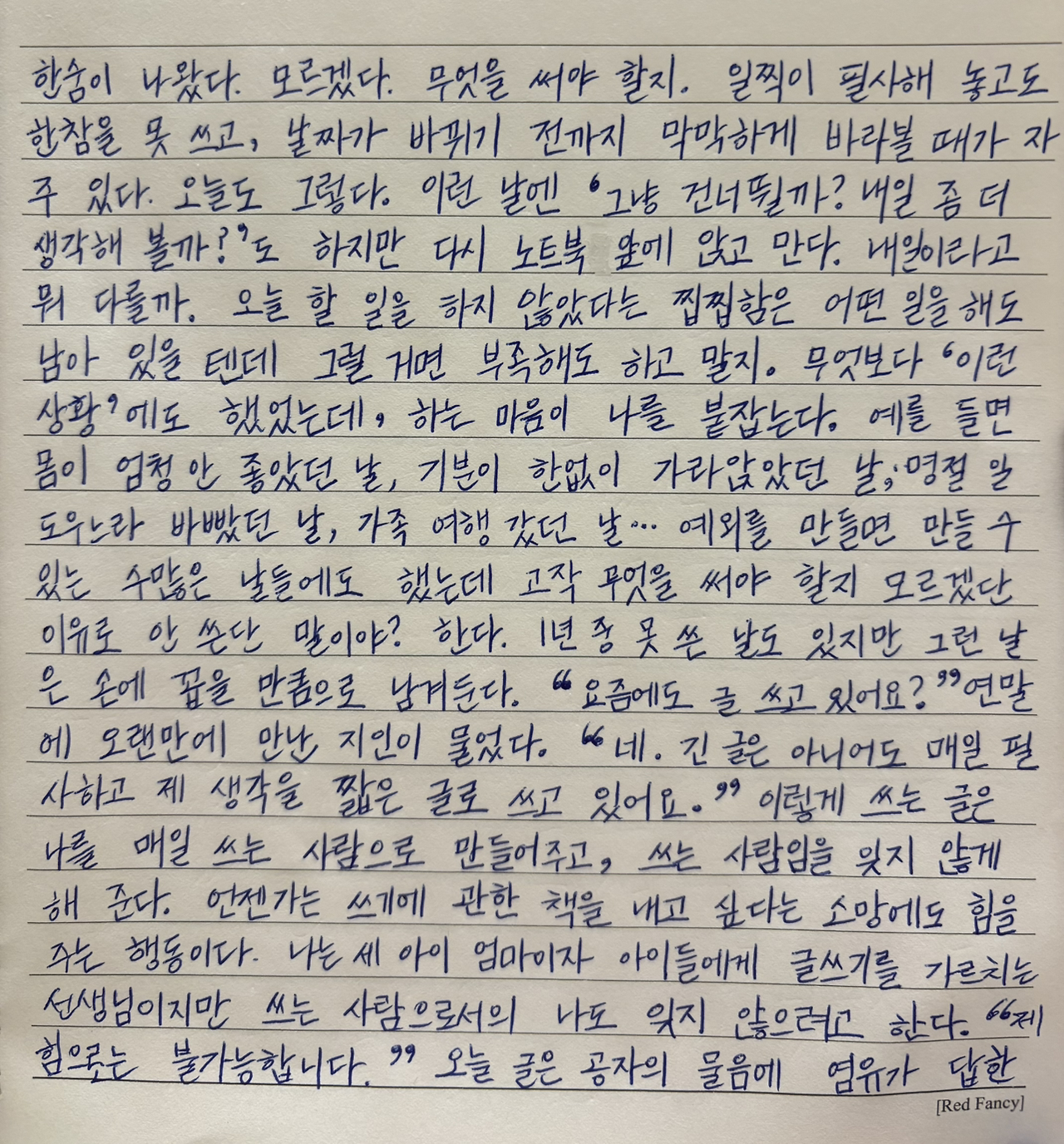 이렇게 쓰는 글은 나를 매일 쓰는 사람으로 만들어주고, 쓰는 사람임을 잊지 않게 해 준다.