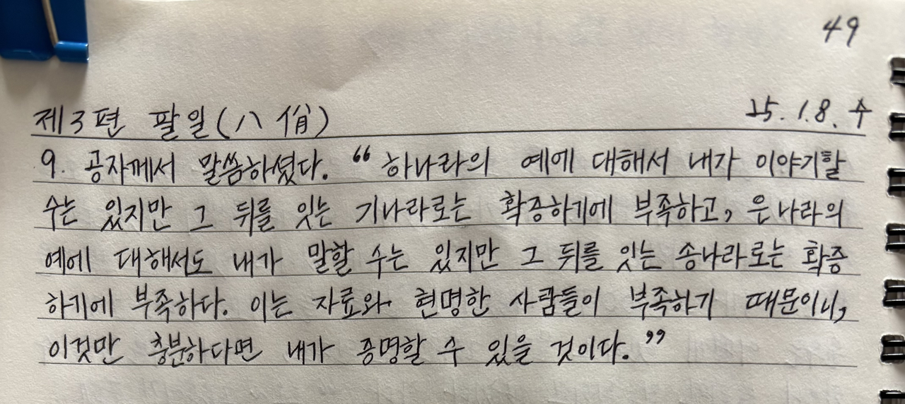 공자께서 말씀하셨다. "하나라의 예에 대해서 내가 이야기할 수는 있지만 그 뒤를 잇는 기나라로는 확증하기에 부족하고, 은나라의 예에 대해서도 내가 말할 수는 있지만 그 뒤를 잇는 송나라로는 확증하기에 부족하다. 이는 자료와 현명한 사람들이 부족하기 때문이니, 이것만 충분하다면 내가 증명할 수 있을 것이다."