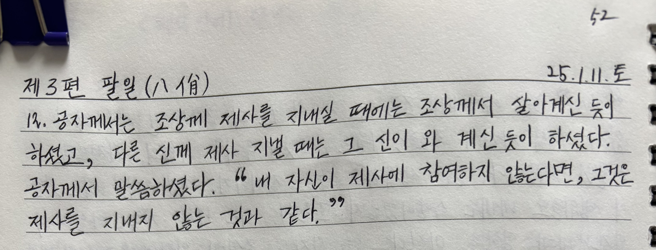 공자께서 말씀하셨다. "내 자신이 제사에 참여하지 않는다면, 그것은 제사를 지내지 않는 것과 같다."