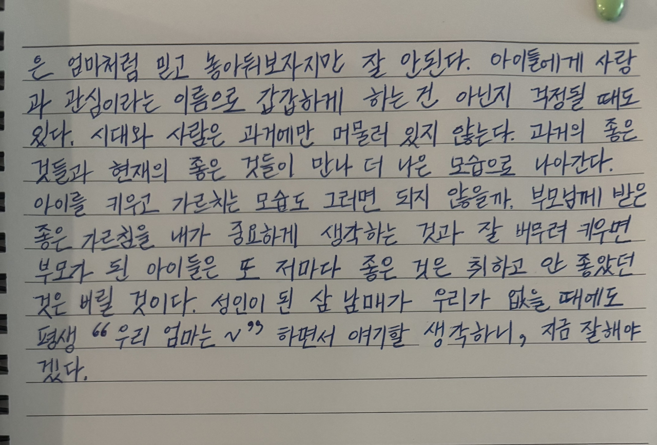 부모님께 받은 좋은 가르침을 내가 중요하게 생각하는 것과 잘 버무려 키우면 부모가 된 아이들은 또 저마다 좋은 것은 취하고 안 좋았던 것은 버릴 것이다.