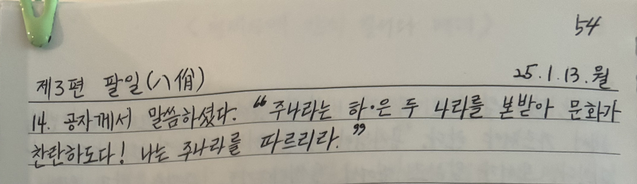 공자께서 말씀하셨다. “주나라는 하, 은 두 나라를 본받아 문화가 찬란하도다! 나는 주나라를 따르리라!”