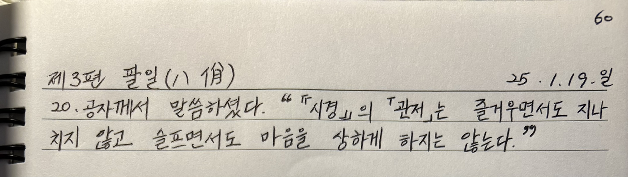 공자께서 말씀하셨다. "『시경』의 「관저」는 즐거우면서도 지나치지 않고 슬프면서도 마음을 상하게 하지는 않는다."