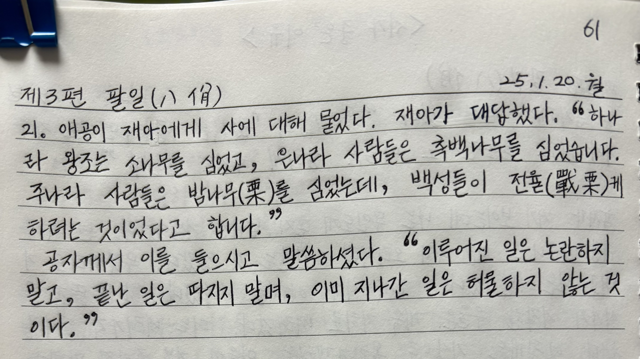 애공이 재아에게 사에 대해 물었다. 재아가 대답했다. “하나라 왕조는 소나무를 심었고, 은나라 사람들은 측백나무를 심었습니다. 주나라 사람들은 밤나무를 심었는데, 백성들이 전율케 하려는 것이었다고 합니다.”