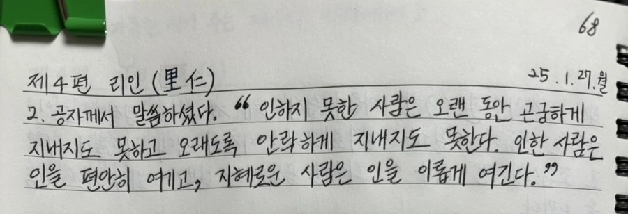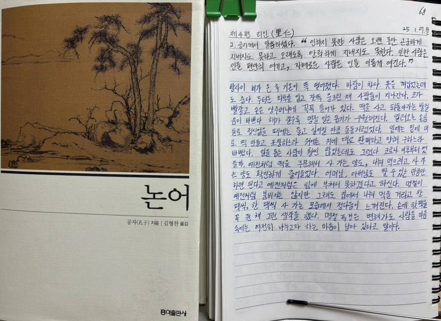 공자께서 말씀하셨다. “인하지 못한 사람은 오랜동안 곤궁하게 지내지도 못하고 오래도록 안락하게 지내지도 못한다. 인한 사람은 인을 편안히 여기고, 지혜로운 사람은 인을 이롭게 여긴다.”