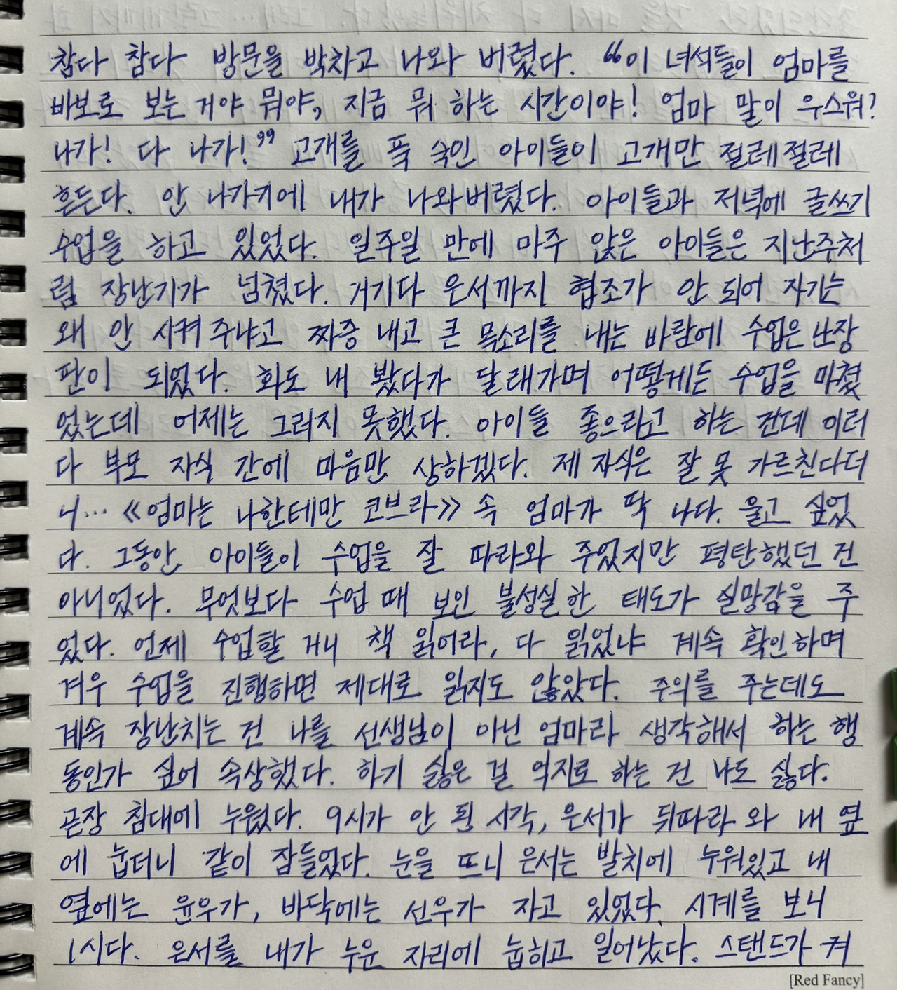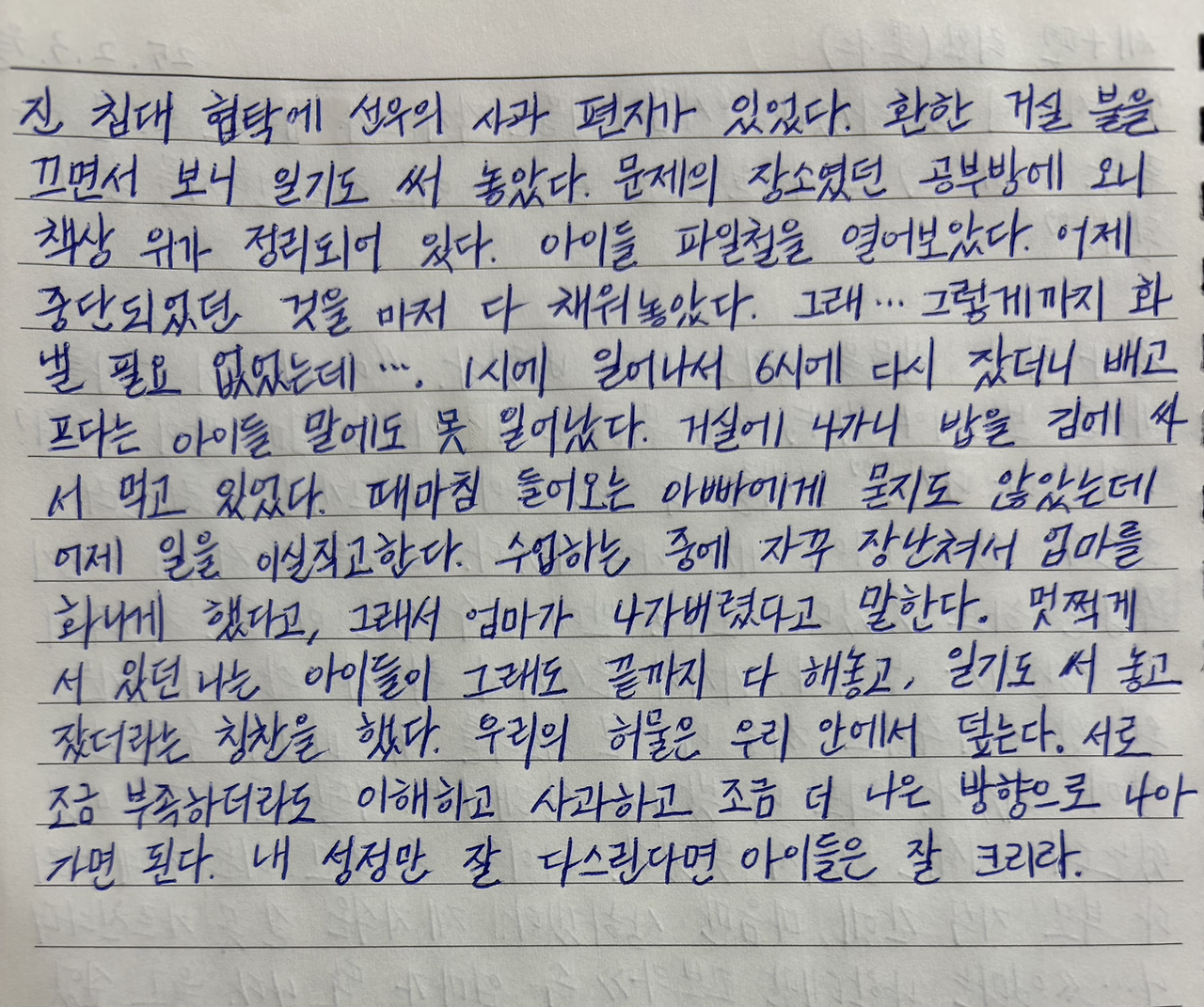 환한 거실 불을 끄면서 보니 일기도 써 놓았다.