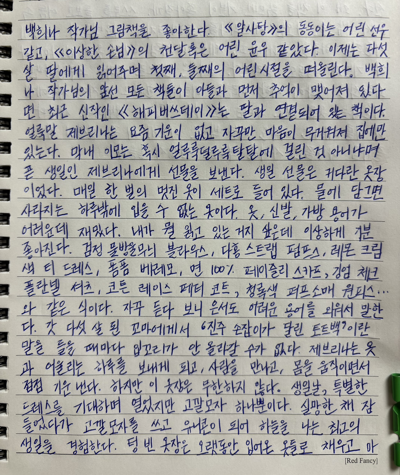 검정 물방울무늬 블라우스, 다홍 스트랩 펌프스, 레몬 크림색 티 드레스, 폼폼 베레모, 면 100% 페이즐리 스카프, 깅엄 체크 플란넬 셔츠, 코튼 레이스 페티코트, 청록색 퍼프소매 원피스… 와 같은 식이다.