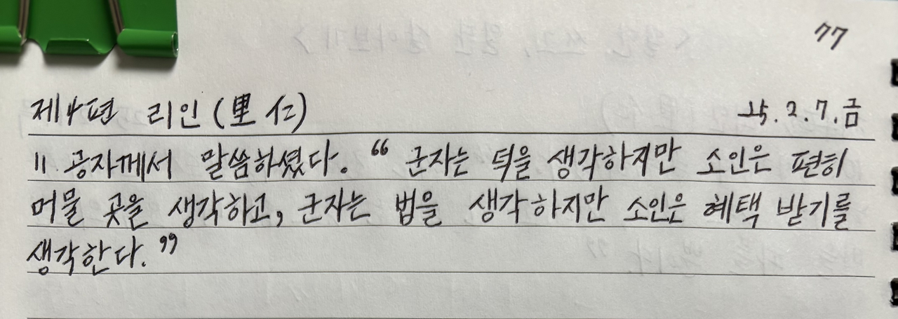 공자께서 말씀하셨다. "군자는 덕을 생각하지만 소인은 편히 머물 곳을 생각하고, 군자는 법을 생각하지만 소인은 혜택 받기를 생각한다."