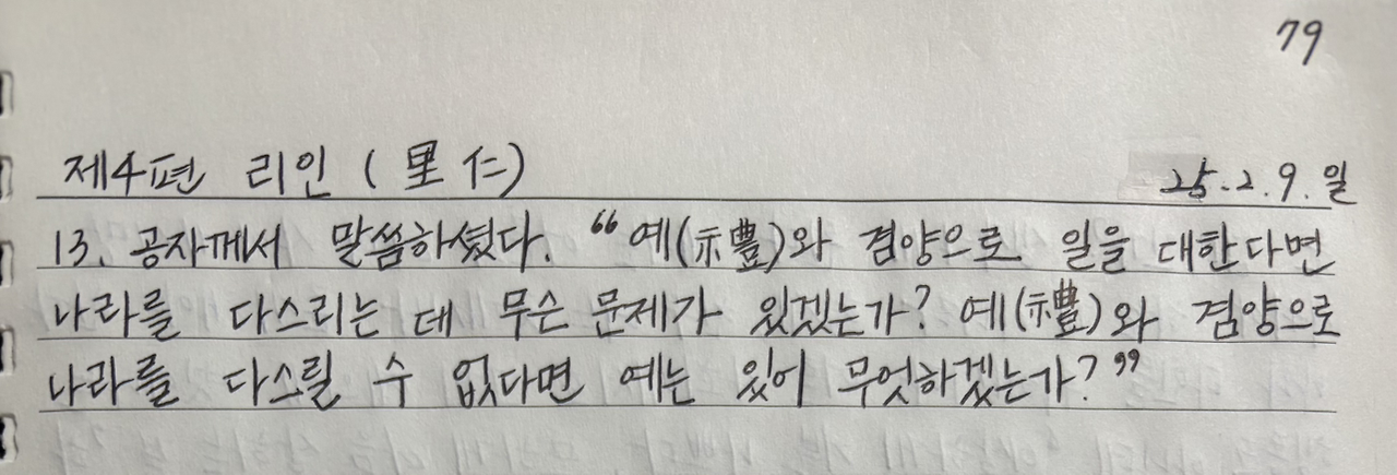 공자께서 말씀하셨다. "예(禮)와 겸양으로 일을 대한다면 나라를 다스리는 데 무슨 문제가 있겠는가? 예(禮)와 겸양으로 나라를 다스릴 수 없다면 예는 있어 무엇하겠는가?"