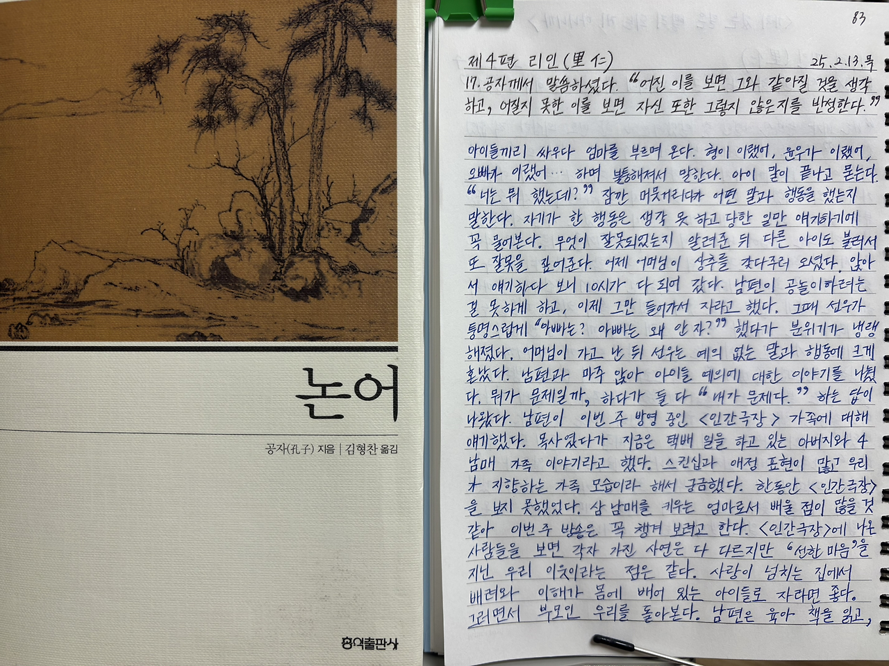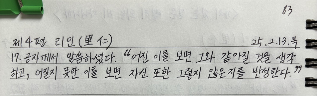 공자께서 말씀하셨다. "어진 이를 보면 그와 같아질 것을 생각하고, 어질지 못한 이를 보면 자신 또한 그렇지 않은지를 반성한다."