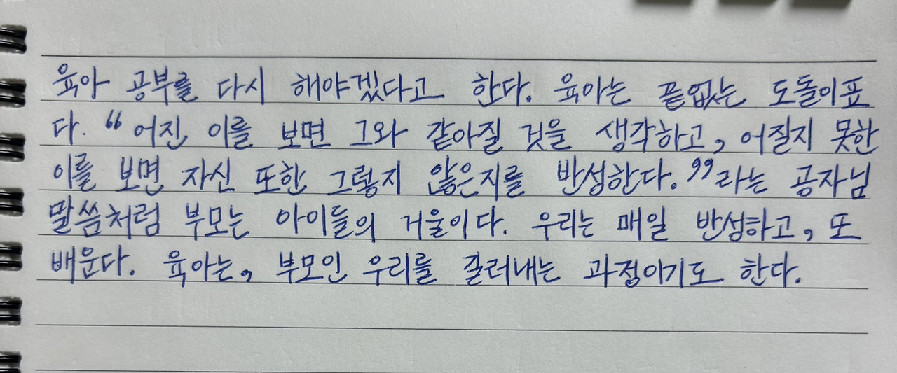 "어진 이를 보면 그와 같아질 것을 생각하고, 어질지 못한 이를 보면 자신 또한 그렇지 않은지를 반성한다."라는 공자님 말씀처럼 부모는 아이들의 거울이다.