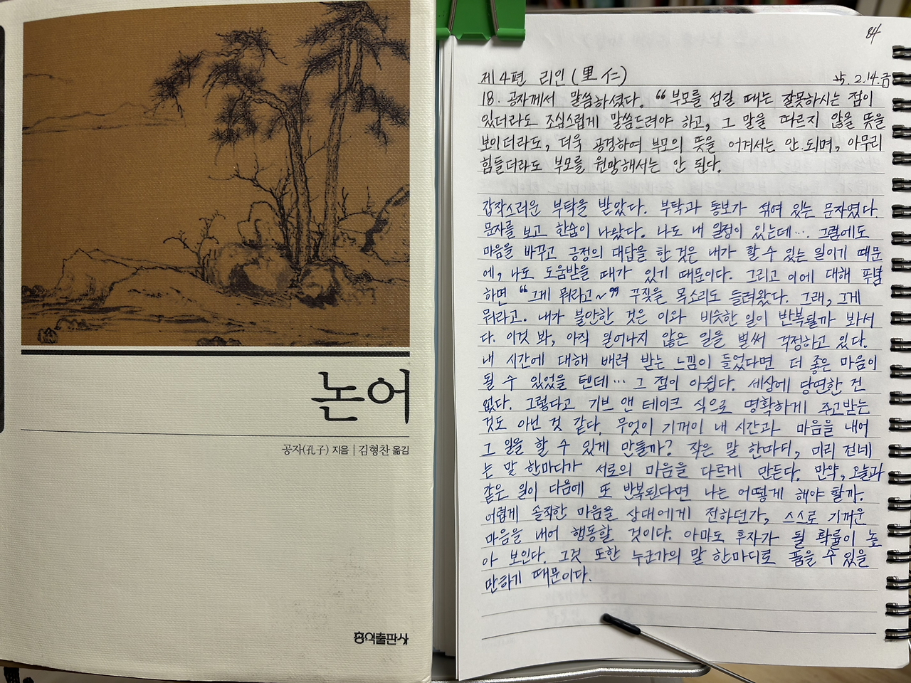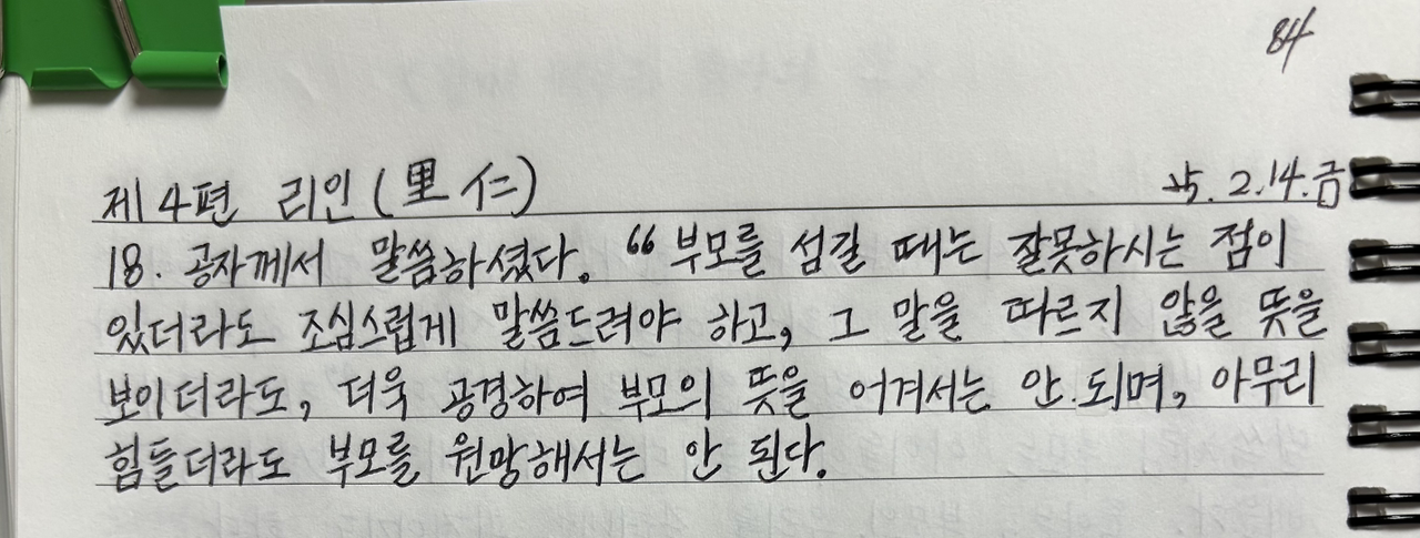 공자께서 말씀하셨다. "부모를 섬길 때는 잘못하시는 점이 있더라도 조심스럽게 말씀드려야 하고, 그 말을 따르지 않을 뜻을 보이더라도, 더욱 공경하여 부모의 뜻을 어겨서는 안 되며, 아무리 힘들더라도 부모를 원망해서는 안 된다."