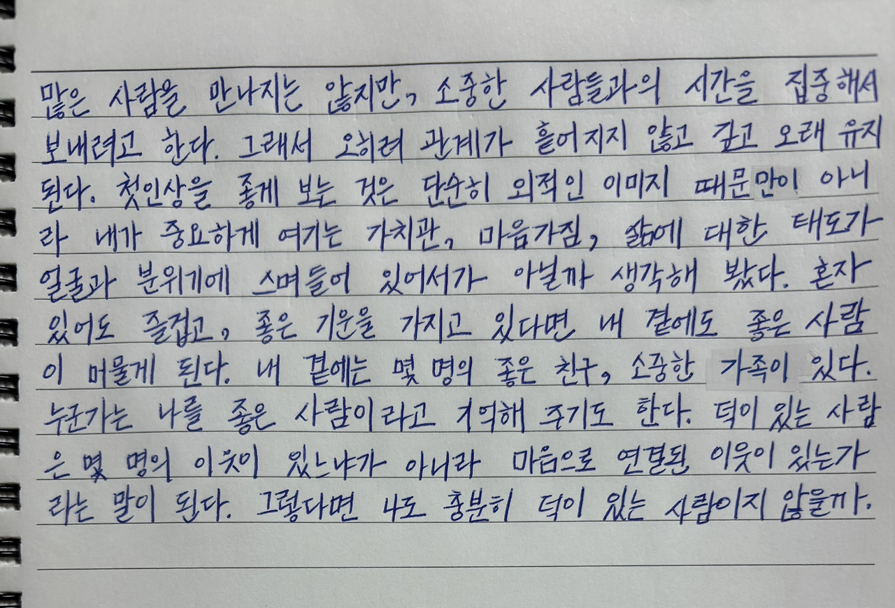 첫인상을 좋게 보는 것은 단순히 외적인 이미지 때문만이 아니라 내가 중요하게 여기는 가치관, 마음가짐, 삶에 대한 태도가 얼굴과 분위기에 스며들어 있어서가 아닐까 생각해 봤다.