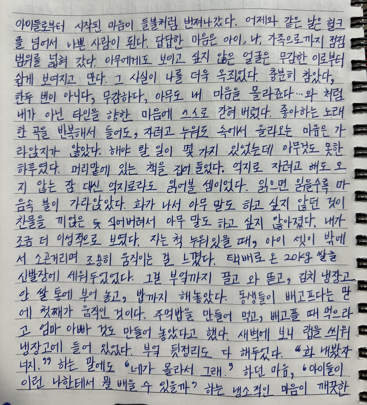 "화 내봤자 너지." 하는 말에도 '네가 몰라서 그래.' 하던 마음, '아이들이 이런 나한테서 뭘 배울 수 있을까.' 하는 냉소적인 마음이 깨끗한 부엌과 대비되었다.